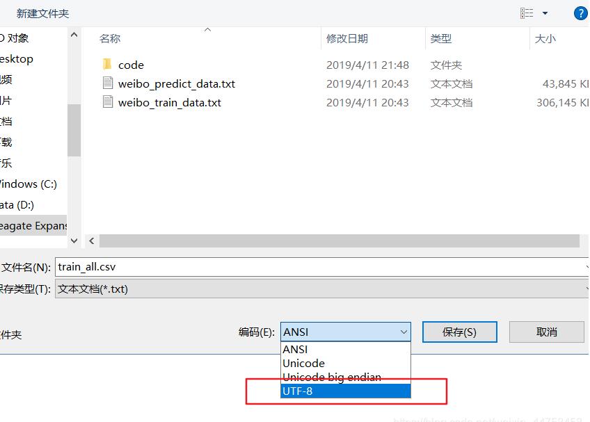 2.打開文件選擇“文件”----->"另存為“,我們可以看到默認編碼是:ANSI,選擇UTF-8重新保存一份,再使用pd.read_csv()打開就不會保存了