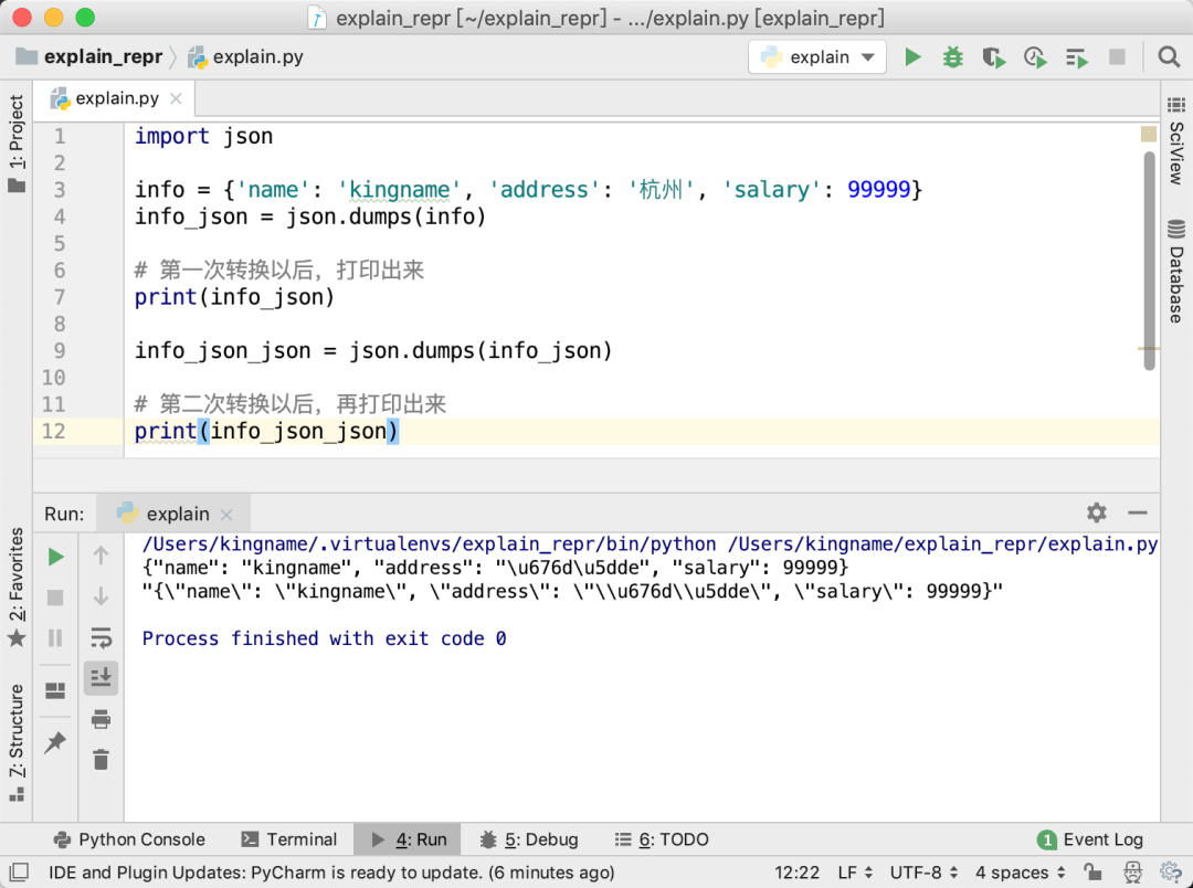首先我們寫一段非常簡單的Python代碼,它的作用是把一個字段先轉(zhuǎn)換為JSON格式的字符串,然后把這個字符串再轉(zhuǎn)換為JSON格式的字符串: