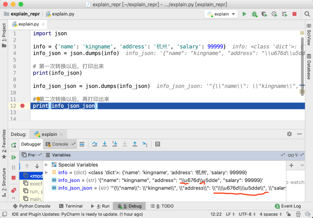 還是上面的代碼,現(xiàn)在把PyCharm的調(diào)試模式打開,然后數(shù)一數(shù)info_json和info_json_json里面反斜杠的個數(shù),如下圖所示: