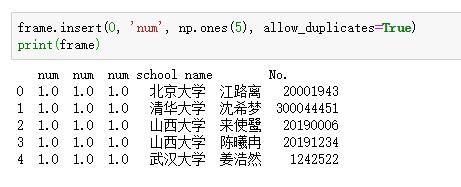 frame.insert(0, 'num', np.ones(5), allow_duplicates=True)