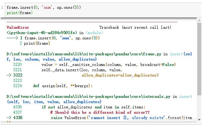 把value插入dataframe的指定位置loc中,若插入的數(shù)據(jù)value已在DataFrame中,則返回 錯(cuò)誤ValueError,如想完成重復(fù)值的插入需要把a(bǔ)llow_duplicates設(shè)置為True