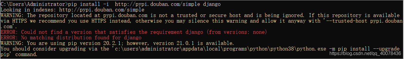 使用pip install命令時(shí),如果出現(xiàn)“WARNING: The repository located at pypi.douban.com is not a trusted or secure host and is being ignored. If this repository is available via HTTPS we recommend you use HTTPS instead, otherwise you may silence this warning and allow it anyway with ‘–trusted-host pypi.douban.com'.”安裝錯(cuò)誤問題: