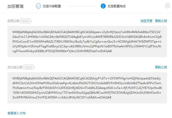 此時會出現(xiàn)應(yīng)用公鑰和支付寶公鑰,將支付寶公鑰保存起來,如圖:
