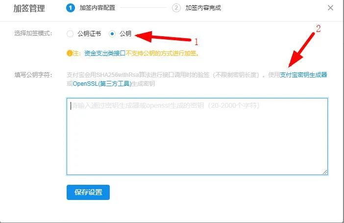 然后點(diǎn)擊RSA2(SHA256)后面的設(shè)置,點(diǎn)擊公鑰并下載支付寶密鑰生成器或者openssl來生成密鑰,這里我選擇支付寶密鑰生成器,如圖: