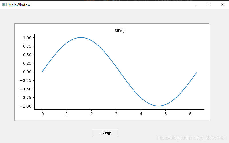 我們使用QGraphicsView插件來(lái)顯示Matplotlib里繪制的圖片。這里演示的功能為:打開(kāi)時(shí)界面默認(rèn)繪制 cos函數(shù)的圖像,點(diǎn)擊按鈕后,繪制sin函數(shù)的圖像。