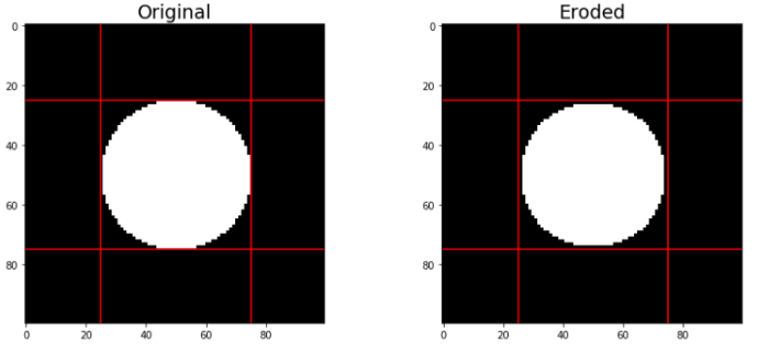 我們可以看到,被腐蝕的圓已經(jīng)略微縮小了。這就是腐蝕一個(gè)對(duì)象的意義。如果我們對(duì)腐蝕函數(shù)進(jìn)行迭代,它的效果會(huì)變得非常明顯。