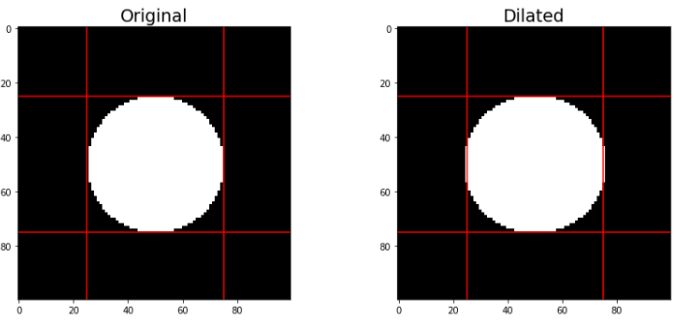 因?yàn)楦g函數(shù)是分別尋找垂直和水平的線條,并慢慢把它們削掉。膨脹函數(shù)將會(huì)讓我們更清晰的理解這一點(diǎn)。