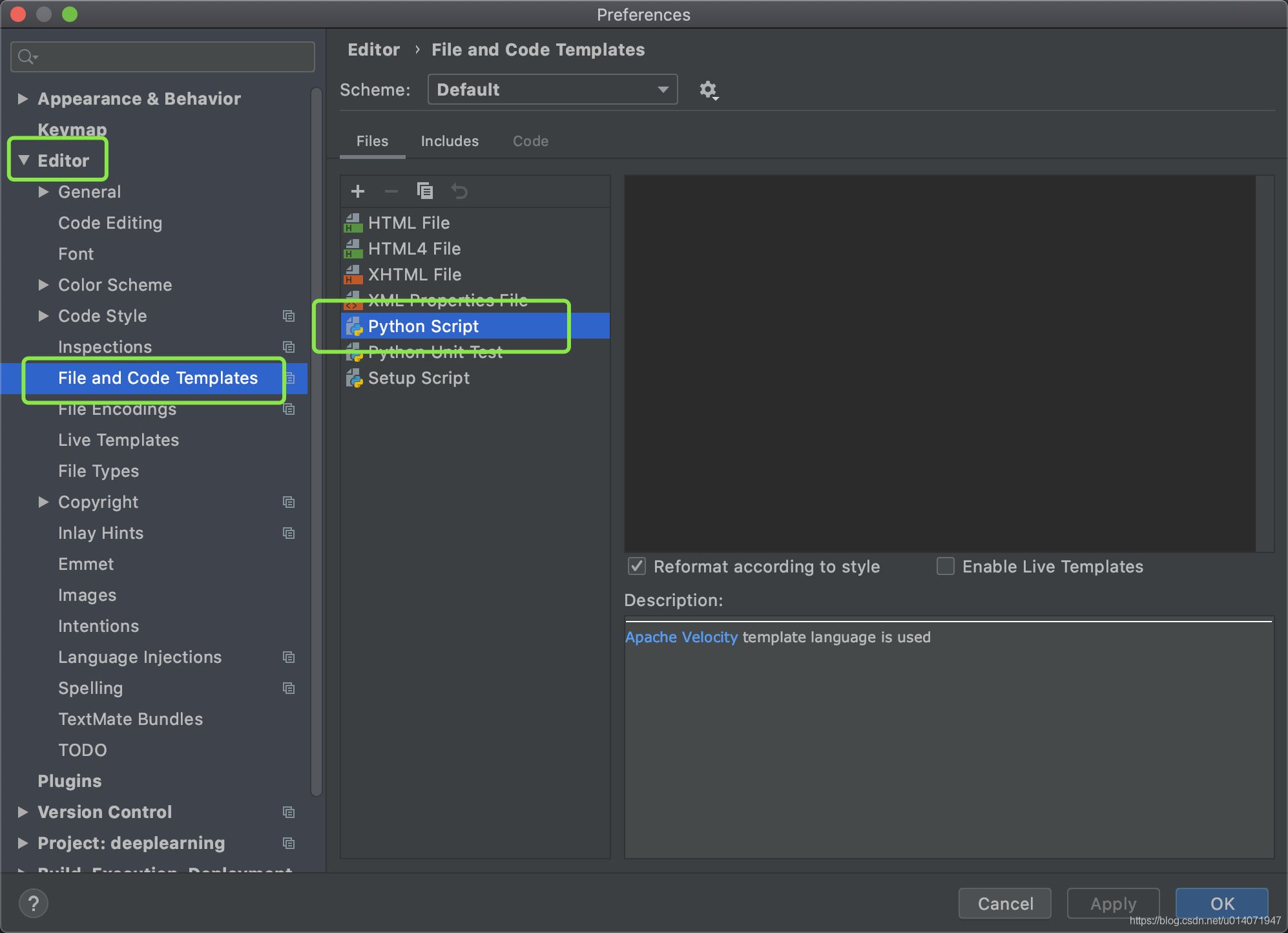 找到 Preferences,點擊進(jìn)入。進(jìn)入后找到 Editor – File and Code Templates – Python Script .
