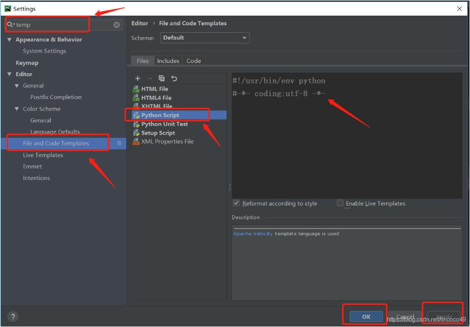 2.搜索temlates,點擊File and Code Templates,點擊右側(cè)的Python Script ,在右側(cè)輸入,在右下角點擊應用,確定。