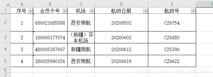 ['序號(hào)', '會(huì)員卡號(hào)', '機(jī)場', '航班日期', '航班號(hào)']