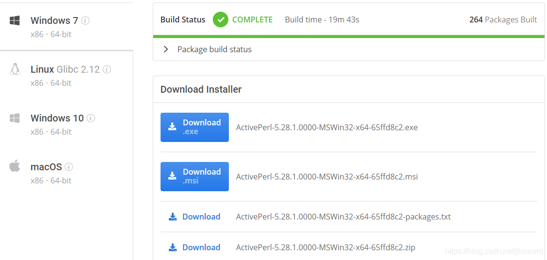 點(diǎn)擊 windows 進(jìn)入ActivePerl-5.28 工程,在右邊選擇下載的windows版本(.msi 或 .exe),注意:由于在2020.03微軟已停止win7的更新,所以ActivePerl-官方只提供了win10x64已構(gòu)建的版本,如果需要下載針對(duì)win7x64的版本,需要自定義構(gòu)建程序,方法參考自定義構(gòu)建包。