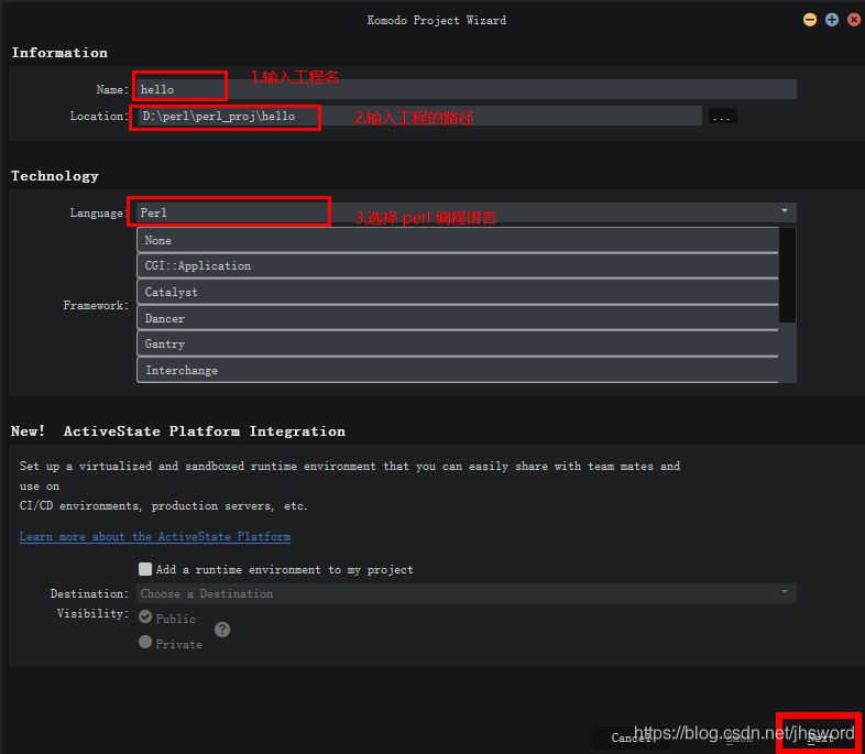 3.登錄后指定ActivePerl 工程名(可自定義)、選擇/提交配置