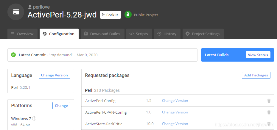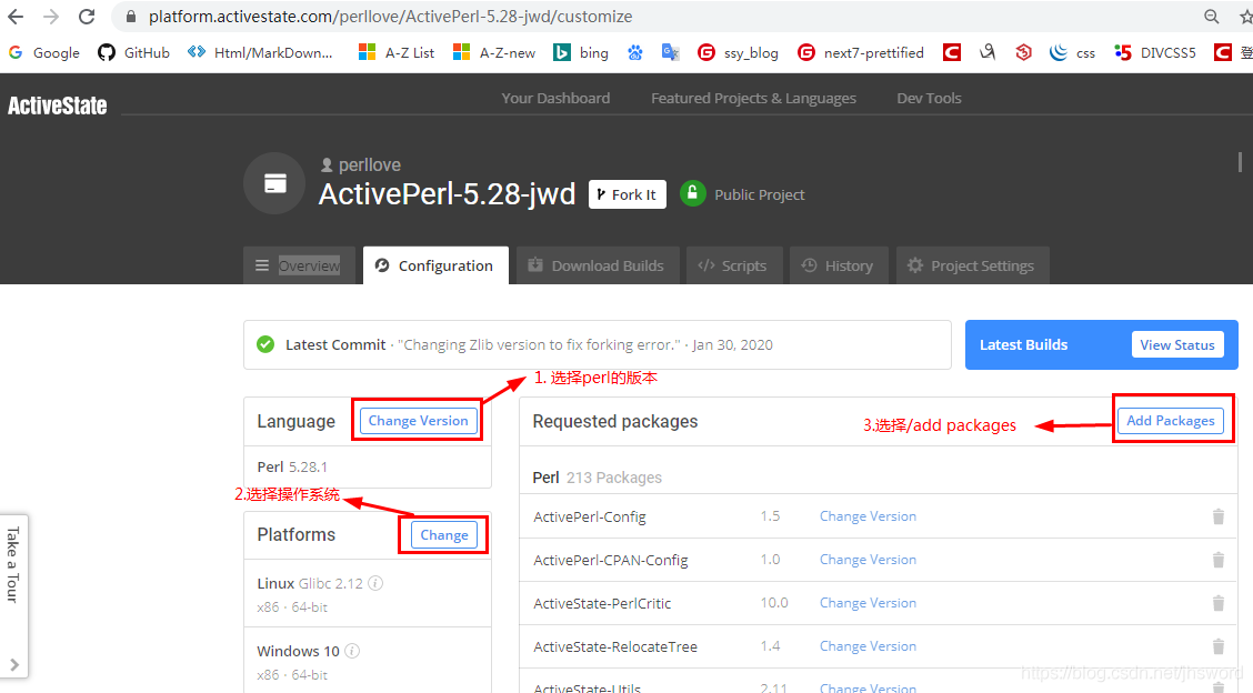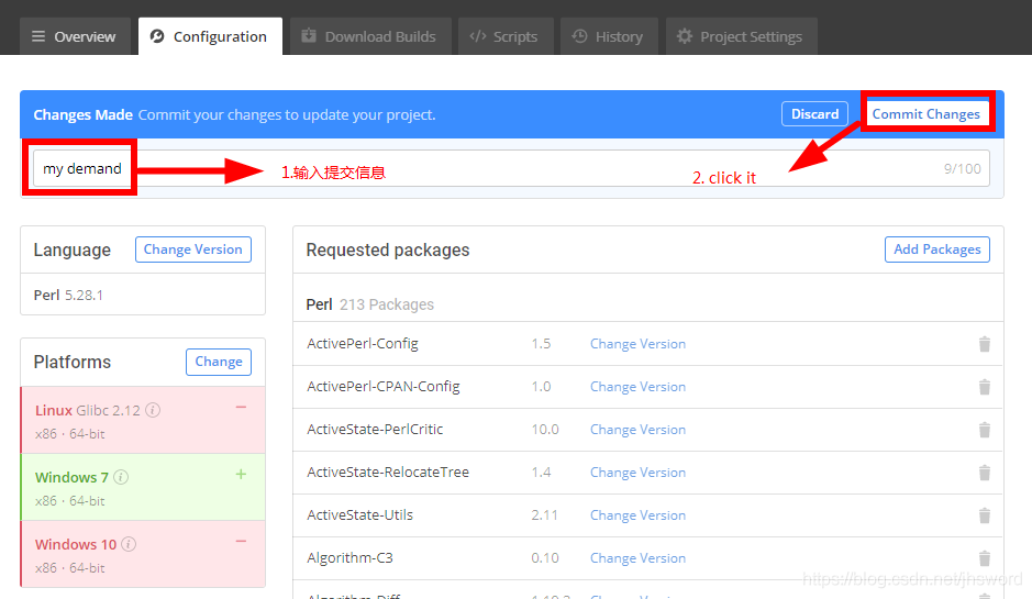 本人選擇的配置:perl 5.28 + win7x64 + packages(all), 然后輸入提交信息,點(diǎn)擊 commit change. (注:可同時(shí)選擇多個(gè)不同的操作系統(tǒng),以備以后使用)