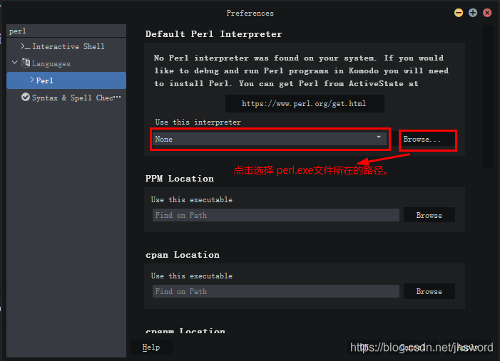 配置perl可執(zhí)行程序的路徑:edit -> preferences -> perl (Edit菜單在右上角)