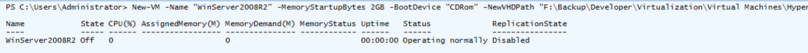 New-VM-Name"WinServer2008R2"-MemoryStartupBytes2GB-BootDevice"CDRom"-NewVHDPath"F:\Backup\Developer\Virtualization\Virtual Machines\Hyper-V\Virtual Hard Disks\WinServer2008R2.vhdx"-NewVHDSize (2048*1000*10) -SwitchName"Hyper-V Switch"