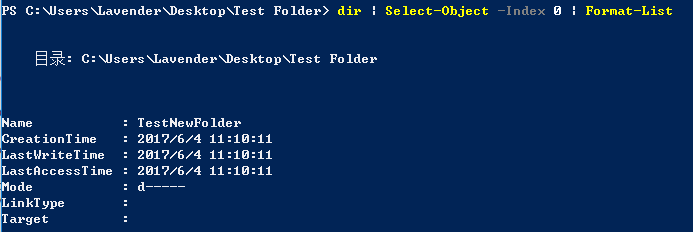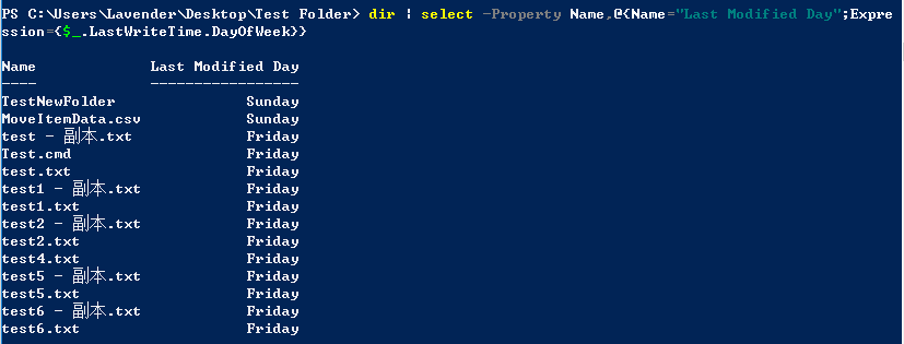 c) 選擇當(dāng)前路徑下所有項(xiàng)目的Name和自定義屬性,名字叫做Last Modified Day,結(jié)果是通過(guò)LastWriteTime屬性算出來(lái)的: