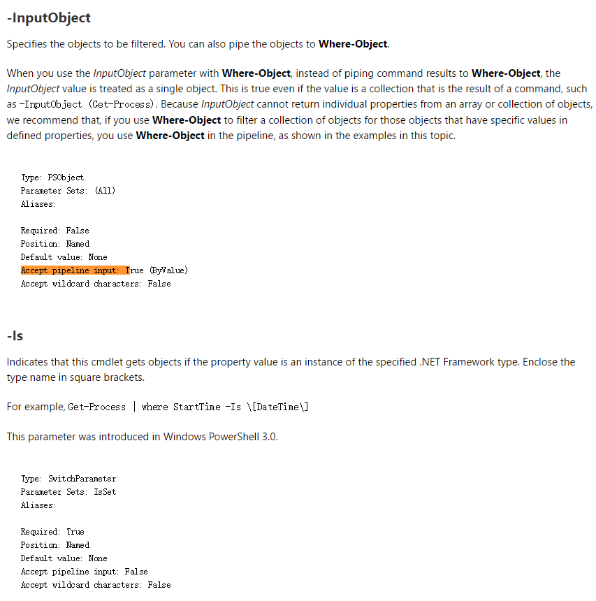 學(xué)會(huì)使用管道后,得學(xué)會(huì)判斷一個(gè)命令是否支持管道輸入。使用Get-Help命令獲取一個(gè)命令的使用方法,對(duì)于參數(shù),可以看到是否支持管道輸入,或者通過(guò)MSDN去查詢命令幫助。