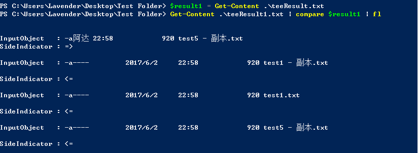 用Compare-Object(別名是compare和diff)可以將兩組對(duì)象進(jìn)行比較,一組對(duì)象為Reference組,而另一組為Difference組。比較的結(jié)果將指示屬性值是只出現(xiàn)在 Reference 組中的對(duì)象中(由 = 符號(hào)指示),或是只出現(xiàn)在 Difference 組中的對(duì)象中(由 => 符號(hào)指示),抑或(在指定了 IncludeEqual 參數(shù)的情況下)同時(shí)出現(xiàn)在這兩個(gè)對(duì)象中(由 == 符號(hào)指示)。