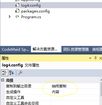 當(dāng)我們在項(xiàng)目里添加nuget包時(shí),查看輸出窗口,可以看到我們的ps1腳本被自動執(zhí)行了,它修改了log4.config的文件屬性,它讓具有“始終復(fù)制”到輸出目錄的屬性!