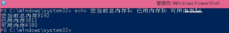 #made by kukisama $a=(get-wmiobject -class Win32_PhysicalMemory -namespace "root\cimv2").Capacity $b=(get-wmiobject -class Win32_PerfFormattedData_PerfOS_Memory -namespace "root\cimv2").AvailableMBytes $c=$a/1024/1024 $d=$c-$b cls echo 您當前總內(nèi)存$c 可用內(nèi)存$b 已用內(nèi)存$d
