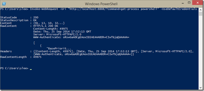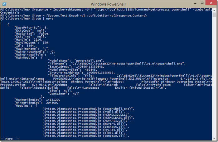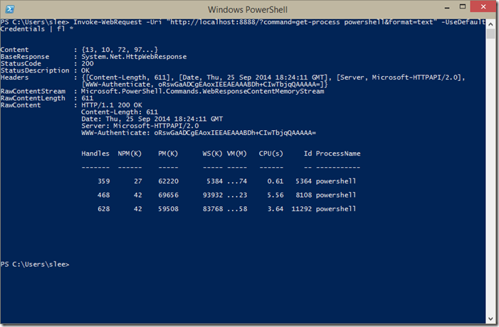 默認(rèn)我讓它監(jiān)聽在8888端口,集成了Windows驗證,但是仍然可以在參數(shù)中配置。這里我打開了另一個PowerShell窗口,并執(zhí)行了“get-process powershell”