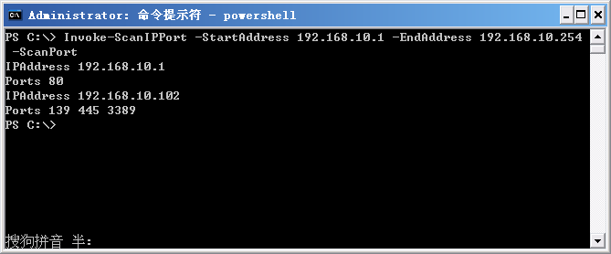 Invoke-ScanIPPort -StartAddress 192.168.10.1 -EndAddress 192.168.10.254#掃描IP段