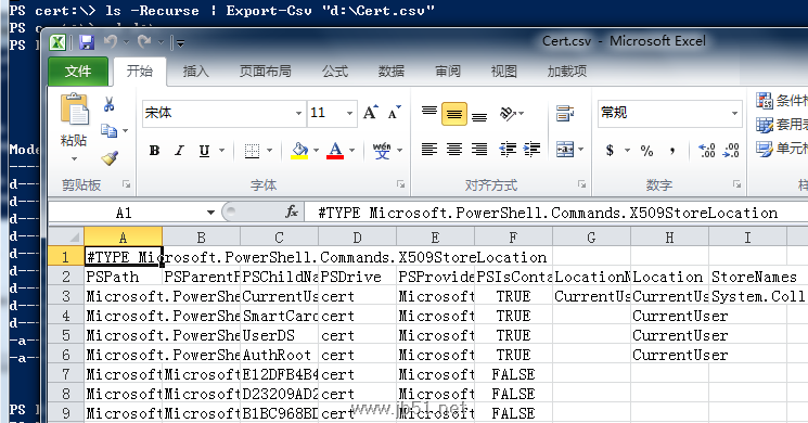 ls -Recurse | Export-CSV “d:\Cert.csv”