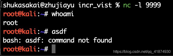 首先在kali上輸入whoami命令,發(fā)現(xiàn)沒(méi)有回顯,因?yàn)榛仫@被重定向到了mac上。