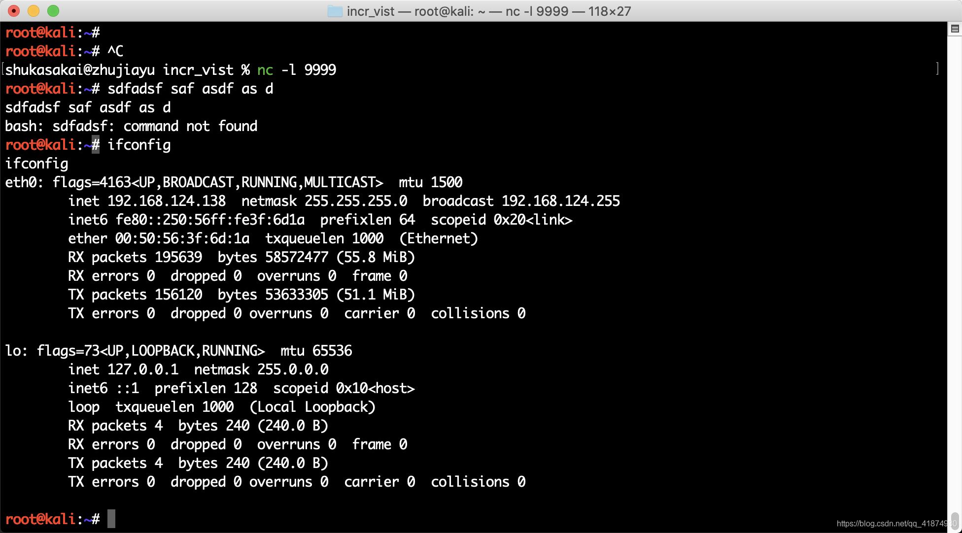 這時(shí)候發(fā)現(xiàn)在kali上按鍵盤已經(jīng)沒(méi)有任何回顯了,回顯全部出現(xiàn)在了mac的shell上: