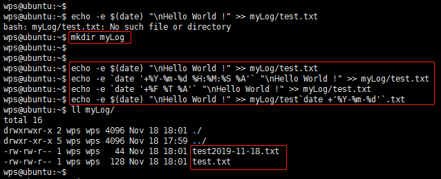 echo -e `date '+%F %T %A'` "\nHello World !" >> test.txt