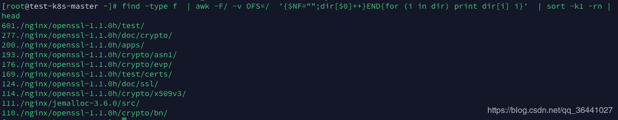 通過find找出指定文件類型的文件,然后管道給 awk,它可以把文本內(nèi)容按行進行格式化輸出并展示,-F / 指定處理文件時字符串之間以 / 進行分割,-v OFS=/ 表示文件顯示結果時以 / 進行分割展示。對于awk命令整體規(guī)則而言有一個 {} END {} 格式,前面的 {} 表示行處理操作,END{} 表示行處理后需要進行整體結果出,在行處理操作邏輯中,設置$NF 為空表示將每一行的文件名信息去除,從而只保留目錄路徑,dir 是一個自增數(shù)組,用于統(tǒng)計結果。最后通過 for 循環(huán)進行遍歷輸出dir關聯(lián)數(shù)組中所有行信息。