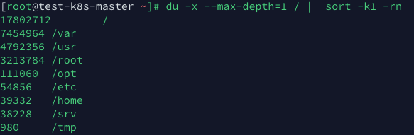 -x表示跳過其他文件系統(tǒng),只分析本文件系統(tǒng)里面的文件,排除一些額外的干擾項;--max-depth=1 表示只分析/ 目錄下第一級目錄下的所有文件大??;-k 表示具體按照那一列進行排序;-r是倒序排列;-n表示只對數(shù)值排序