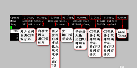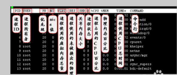 顯示內(nèi)容依次為“進(jìn)程ID”、“進(jìn)程所有者”、“優(yōu)先級”、“nice值,負(fù)值表示高優(yōu)先級,正值表示低優(yōu)先級”、“進(jìn)程使用的虛擬內(nèi)存總量”、“進(jìn)程使用的、未被換出的物理內(nèi)存大小”、“共享內(nèi)存大小”、