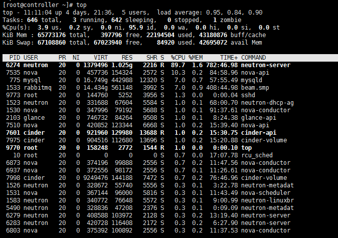 6274 neutron 20 0 1379496 1.025g 2216 R 89.7 1.6 782:46.98 neutron-server