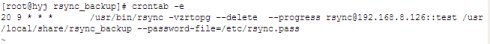 20 9 * * * /usr/bin/rsync -vzrtopg --delete --progress rsync@192.168.8.126::test /usr/local/share/rsync_backup --password-file=/etc/rsync.pass