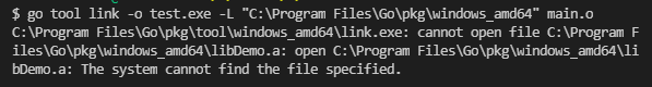 C:\Program Files\Go\pkg\tool\windows_amd64\link.exe: cannot open file C:\Program Files\Go\pkg\windows_amd64\libDemo.a: open C:\Program Files\Go\pkg\windows_amd64\libDemo.a: The system cannot find the file specified.