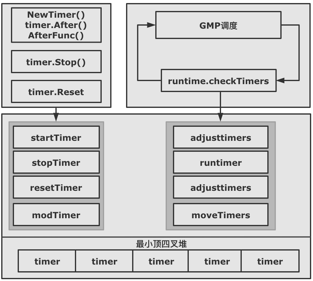 GMP 在調(diào)度周期內(nèi)中會(huì)調(diào)用 checkTimers ,遍歷該 P 的 timer 堆上的元素,根據(jù)對(duì)應(yīng) timer 的狀態(tài)執(zhí)行真的操作。