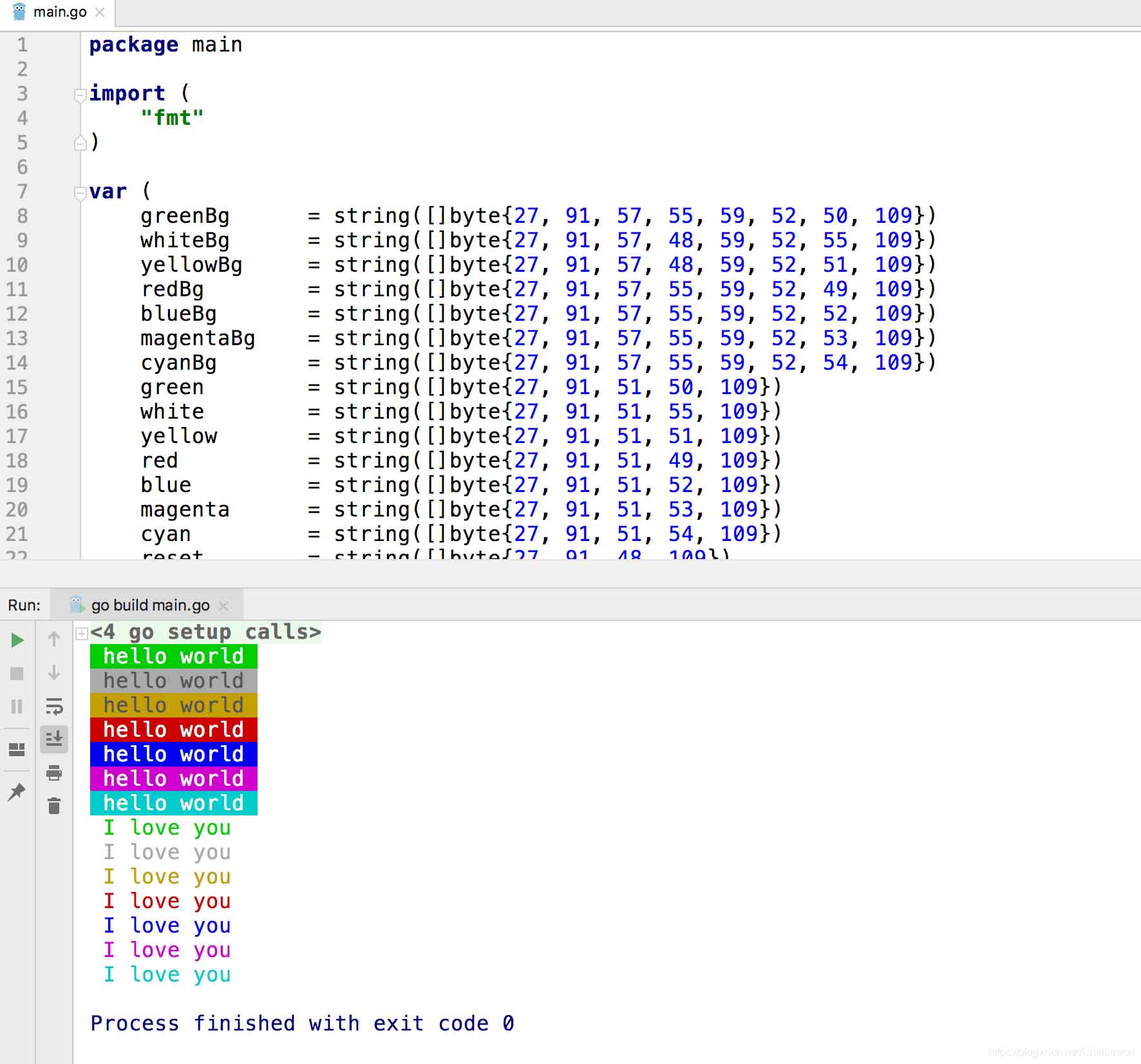 fmt.Printf("\x1b[%d;%dmhello world \x1b[0m 41: 紅 36: 深綠 \n", 41, 36)