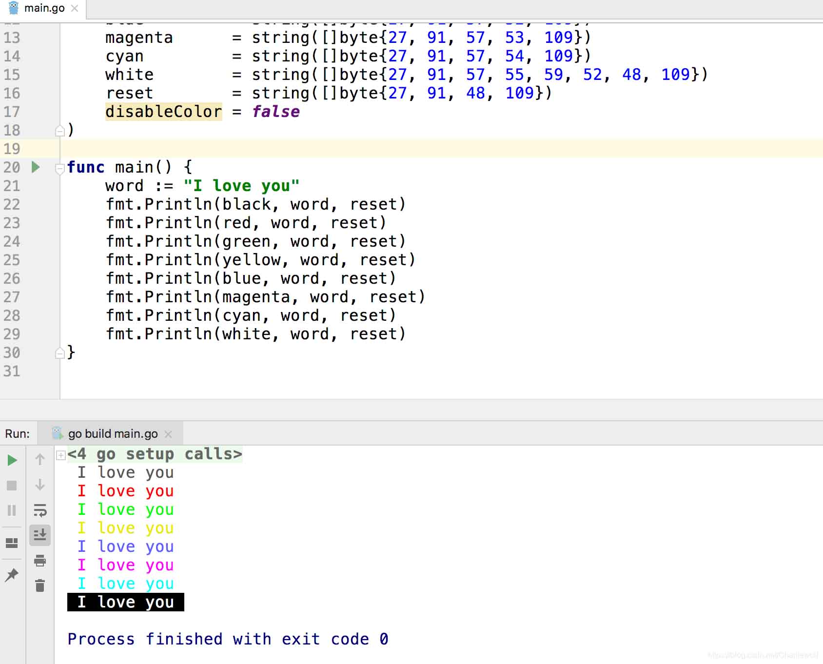 fmt.Printf("%c[0;41;36m%s%c[0m\n", 0x1B, "testPrintColor", 0x1B)