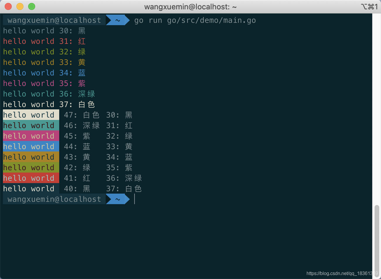 fmt.Printf("\x1b[%d;%dmhello world \x1b[0m 40: 黑 37: 白色 \n", 40, 37)