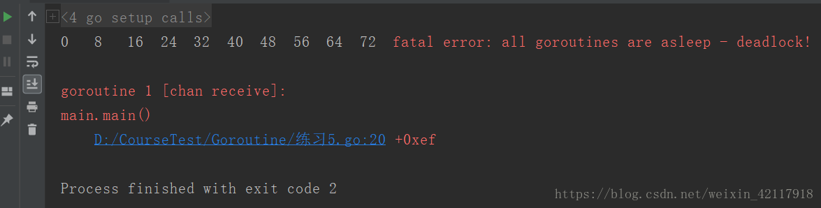 (2)如果讀的次數(shù)多于寫的次數(shù)會(huì)發(fā)生:fatal error: all goroutines are asleep - deadlock! ,若 在mm1中對(duì)ch8進(jìn)行關(guān)閉(執(zhí)行 close(ch8) ),多于的次數(shù)讀到的數(shù)據(jù)為0(數(shù)據(jù)默認(rèn)值)。