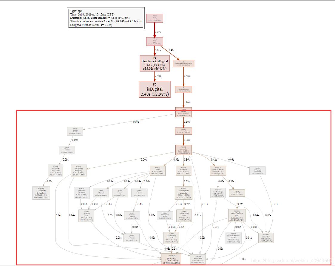 很明顯,正則需要重新分配內(nèi)存較多,從pprof生成圖也可以看出,正則調(diào)用關(guān)系錯綜復雜