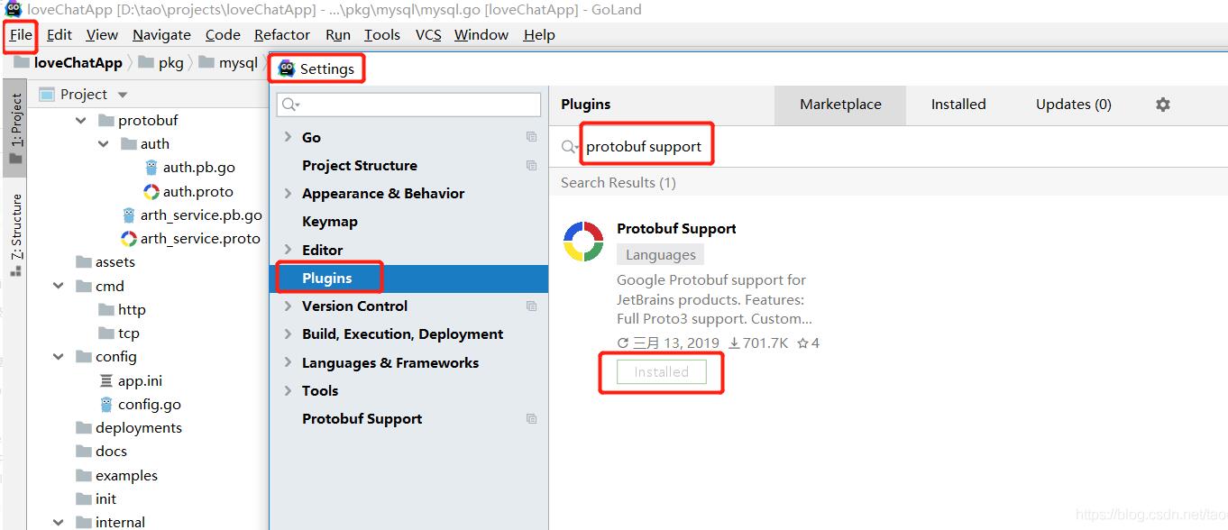 1、File->Settings->Plugins->Browse repositories->輸入protobuf support->install,并重啟IDE