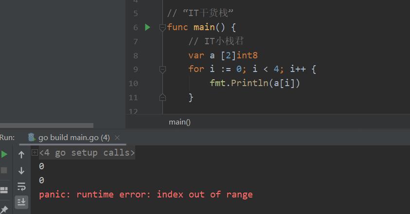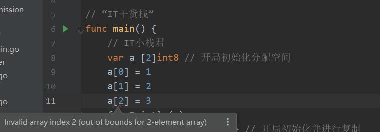 但是在go語言中并沒有方法來進行增刪改查值,只有通過下標(biāo)的方式,所以我們?nèi)绻M行了越界處理編譯都會進行報錯。所以才入門的小伙伴們需要注意一下哦。數(shù)組的下標(biāo)在數(shù)組的合法范圍之外就會出發(fā)訪問越界,會有panic出現(xiàn)。所以小棧君也是通過了一個實例給大家說明一下,因為編譯可能會不通過,所以我們巧妙的避開編譯器的編譯進行數(shù)組的越界操作說明。