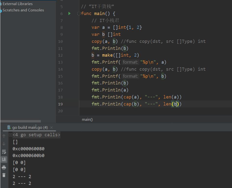 上述的一個例子可以綜合說明幾點問題了,最開始我們定義了一個切片并且容量是2,內(nèi)容是1和2,我們同樣定義了切片b但是并沒有做初始化處理。直接使用copy操作。使用copy操作的時候,小棧君也復(fù)制了源碼出來,第一個是我們的數(shù)據(jù)源,第二個參數(shù)傳遞我們的目標(biāo)源。直接使用的話我們可以從結(jié)果看出并沒有成功。