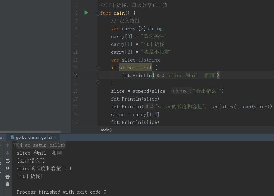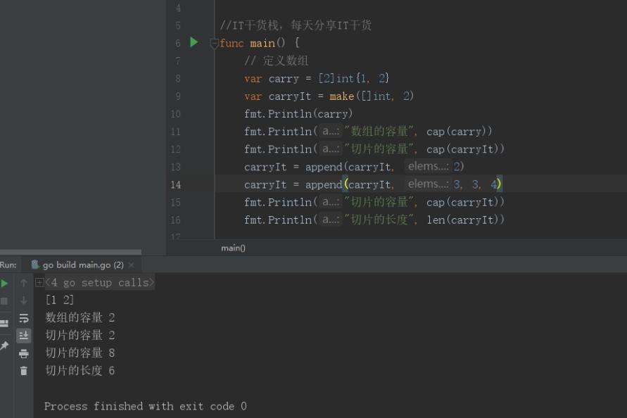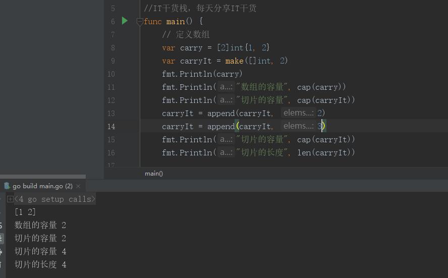言歸正傳,為了測試一下切片的擴容機制,所以小棧君又進行了切片的增加,此時,細心的小伙伴應(yīng)該發(fā)現(xiàn),這次小棧君一次性增加了兩個元素在一個append里面,因為這是append方法是一個可變長度的傳值。這也是一個小知識點哦。