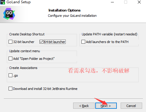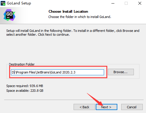 2.雙擊運(yùn)行GoLand2020.2.3安裝包,設(shè)置安裝位置,建議將其安裝到固態(tài)硬盤(如果有),然后單擊下一步