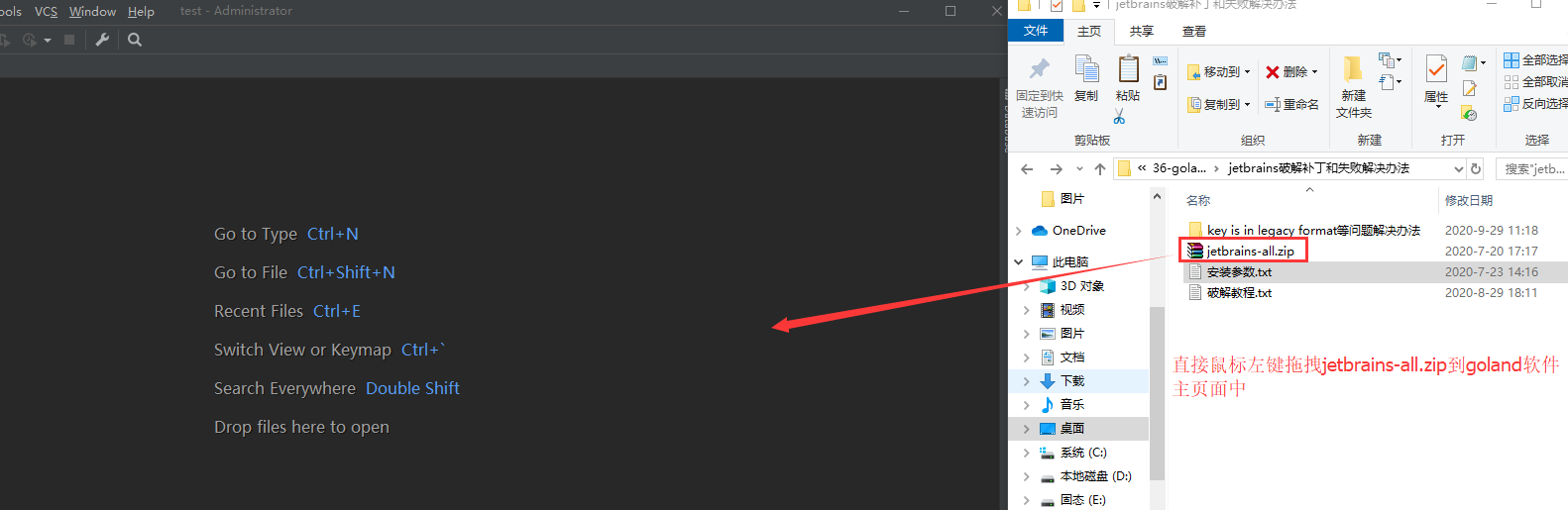 10.從下載的GoLand2020 破解包中,解壓后(Mac不用自帶解壓工具,推薦The unarchiver),找到j(luò)etbrains-all.zip,用鼠標(biāo)左鍵拖拽到GoLand主界面(注意jetrains-all.zip不需要解壓!)