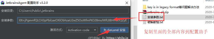 12.GoLand重啟后會(huì)彈出配置助手。此時(shí),用記事本打開安裝參數(shù).txt。把里面的所有內(nèi)容復(fù)制到 配置助手的安裝參數(shù)里,點(diǎn)擊 為goland安裝。