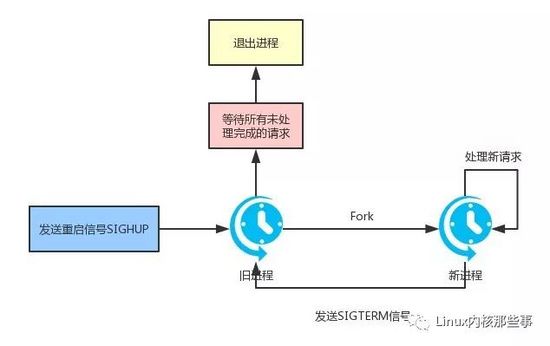 從原理圖可以知道,重啟時首先通過發(fā)送 SIGHUP信號 給服務(wù)進程,服務(wù)進程收到 SIGHUP信號 后會 fork 一個新進程來處理新的請求,然后新進程會發(fā)送 SIGTERM信號 給舊服務(wù)進程(父進程),舊服務(wù)進程接收到 SIGTERM信號 后會關(guān)閉監(jiān)聽的 socket句柄 (停止接收新請求),并且等待未處理完成的請求完成后再退出進程。